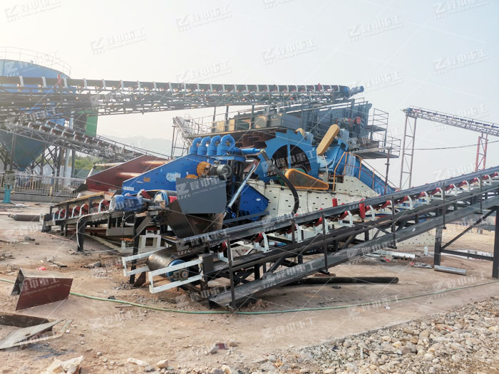 工作流程:物料人工砂或天 然砂,經(jīng)由皮帶機給料至篩分裝置,篩上物料作為成品由皮帶機輸送至堆場,篩下物則通過流槽進入洗砂裝置,并在洗砂裝置中進行充分浸泡、攪拌、清洗,清洗過的物料再運送到前端脫水設備中時行脫水、回收,產(chǎn)出合格的成品砂。